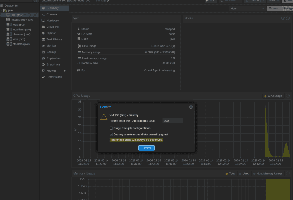 Power off your Proxmox server or disconnect its storage. - VM deletion